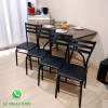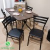 Mesa de Jantar Moderna com tampo em madeira escura e base metálica preta, acompanhada de 4 cadeiras em estrutura preta com revestimento em corino preto.