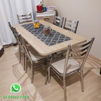 Conjunto de mesa de sala de jantar com base Ipanema tubular cromada, tampo de 1,60 m x 0,80 m madeirado claro, cantos redondos.