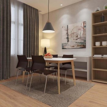 Dispostas em uma mesa de madeira com tampo branco, sobre tapete cinza e cercadas por um ambiente de tons neutros e madeirado claro, essas cadeiras ganham destaque sutil sob a meia-luz de um abajur elegante e um lustre central 💡🕯️