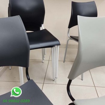 Nesta cena, destacamos duas versões em polipropileno cinza, com nuances sutis de tonalidade que enriquecem a composição visual 🎨. A estrutura em pintura epóxi preta e branca valoriza o contraste e amplia as possibilidades de combinação em ambientes residenciais ou comerciais.